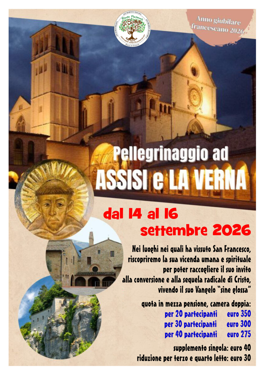 Nei luoghi nei quali ha vissuto San Francesco, riscopriremo la sua vicenda umana e spirituale per poter raccogliere il suo invito alla conversione e alla sequela radicale di Cristo, vivendo il suo Vangelo “sine glossa”